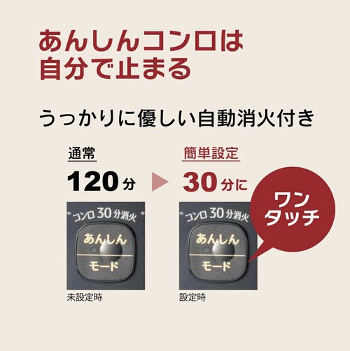 ボタンをひと押しするだけで通常120分で消し忘れ消火するところ、30分で自動消火。ついうっかりの消し忘れもフォローします!