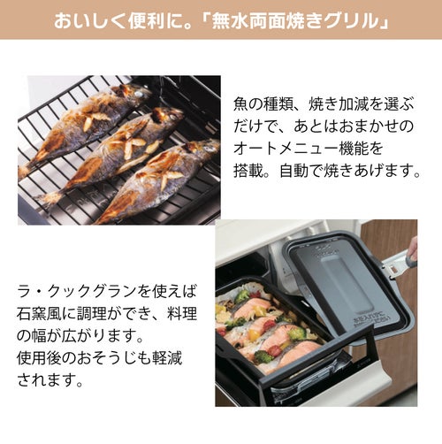 小さくなった排気口でお手入れ簡単。タイマーと温度調節機能の同時使用で“ながら”調理が可能!ラ・クックグランで料理の幅が広がり、グリル庫内への油はねが少なくグリルの調理を気軽に楽しめます。