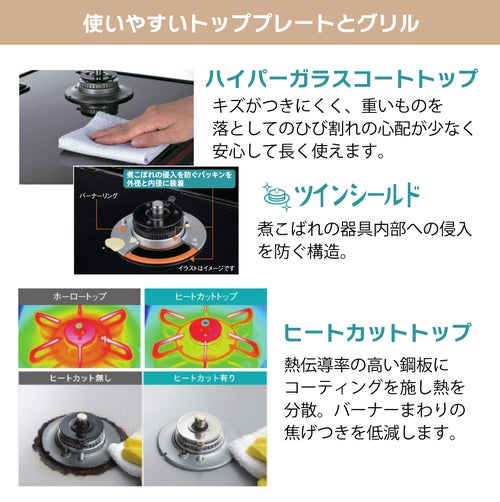 タシンプル&スタイリッシュ。お手入れも調理もラクにしてくれる、頼れるガスコンロ。ハイパーガラスコートトップを採用し、キズに強く汚れもサッと拭き取りやすい設計。毎日の暮らしに寄り添う、便利機能が充実したテーブルコンロです。