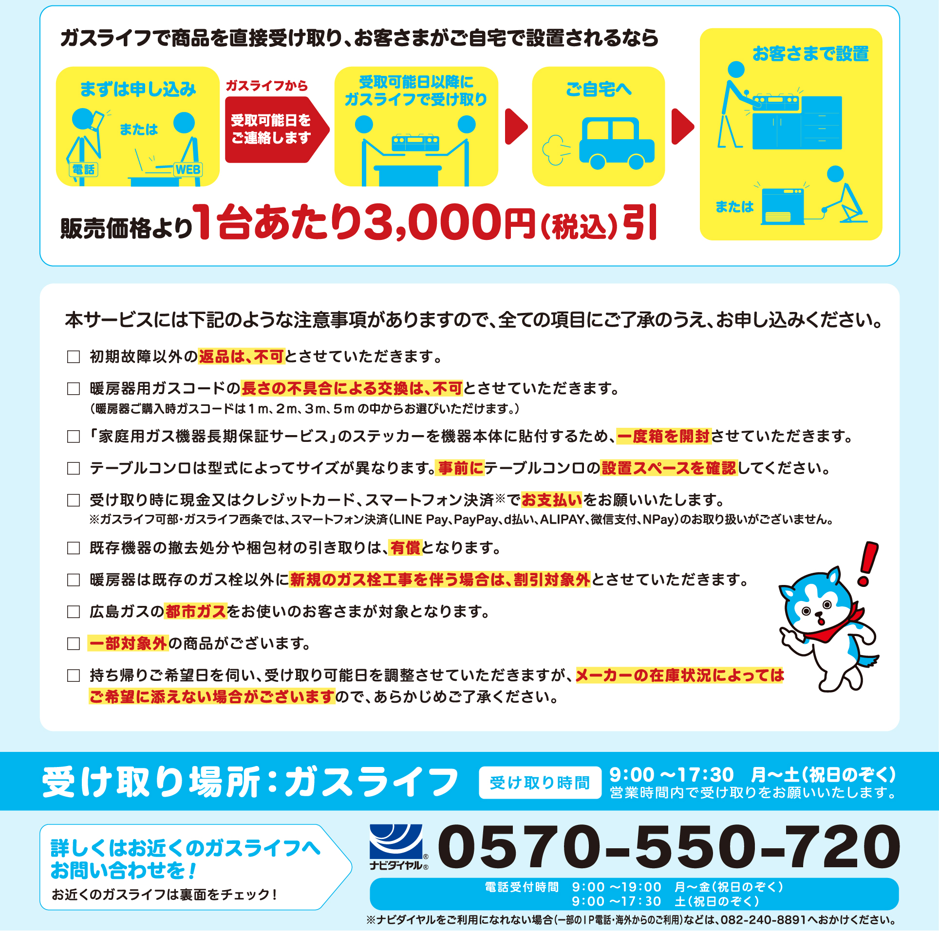 テーブルコンロ、およびガス暖房器が対象となる割引で、ガスライフで商品を直接受け取り、お客さまがご自宅で設置いただく場合、販売価格より1台あたり3,000円(税込)引きいたします。持ち帰り割には注意事項がありますので、全ての項目にご了承のうえお申し込みください。