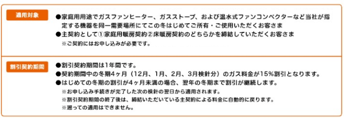 ガスファンヒーターをはじめてご所有・ご使用いただくお客さまの最初の冬期4ヵ月間のガス料金が、割引契約期間に限りおうちまるごと15%OFFになる付帯契約型の料金メニューです。