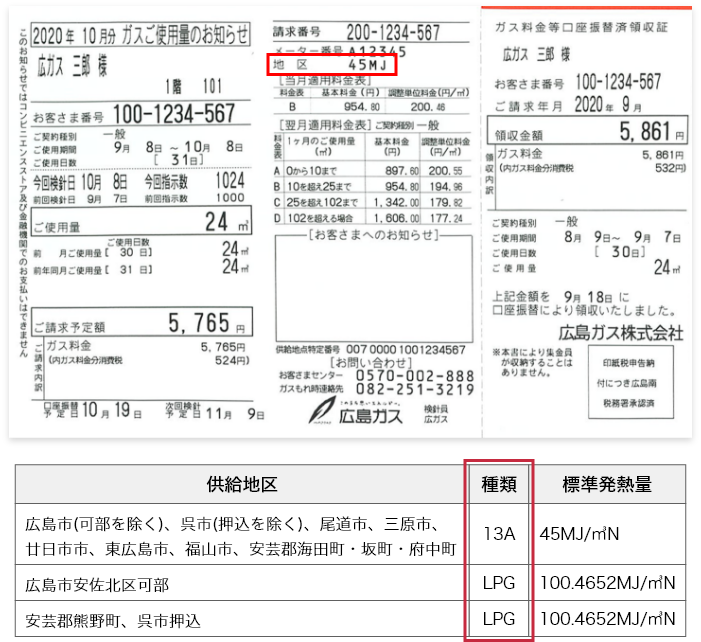 広島ガスの都市ガスは供給地区により、「13A」「LPG」の2種類がありますので、検針表の「地区」をご覧いただき、ご使用ガス種をご確認ください。広島ガスグループのプロパンガスをご利用のお客さまのガス種は「LPG」です。