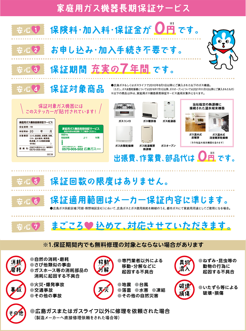 広島ガスではガス機器(ガスコンロ・ガス暖房器・ガス給湯器・ガス給湯暖房熱源機・ガス衣類乾燥機・ガスオーブン・当社指定の熱源機に接続された温水端末機器)には購入された日から7年間の無料保証がついています。