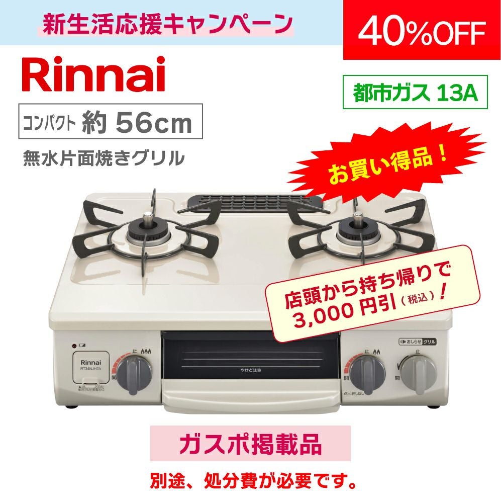 他の画像を見る 商品番号 G5233 テーブルコンロ RT34NJH7A-C(L/R) 【コンパクト約56cm】 都市ガス13A限定 7年保証付 片面焼き メーカー希望小売価格 ¥ 46,200 WEB販売価格 ¥ 27,500 税込 販売期間 2026/01/05 9:00 〜 2026/03/31 17:00