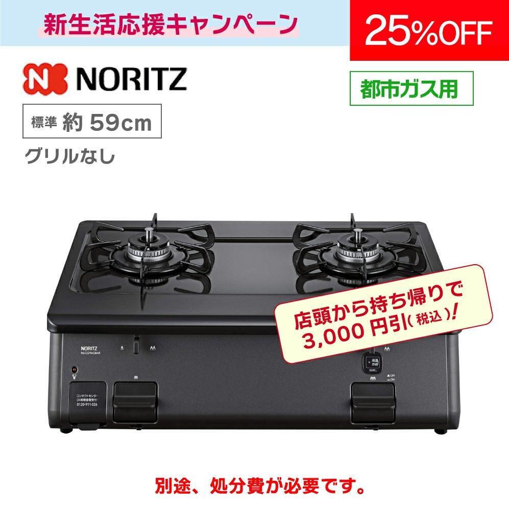 他の画像を見る 商品番号 G5235 【グリルなし】テーブルコンロ NLC2296QBA(L/R)【標準 約59cm】 都市ガス限定 7年保証付 メーカー希望小売価格 ¥ 44,440 販売価格 ¥ 33,000 税込 販売期間 2026/01/05 9:00 〜 2026/03/31 17:00