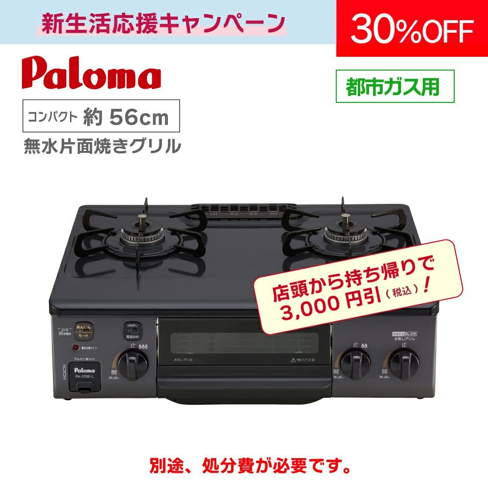 他の画像を見る 商品番号 G5237 テーブルコンロ PA-S76B-(L/R) 【コンパクト約56cm】 都市ガス限定 7年保証付 片面焼き メーカー希望小売価格 ¥ 46,970 WEB販売価格 ¥ 32,700 税込 販売期間 2026/01/05 9:00 〜 2026/03/31 17:00